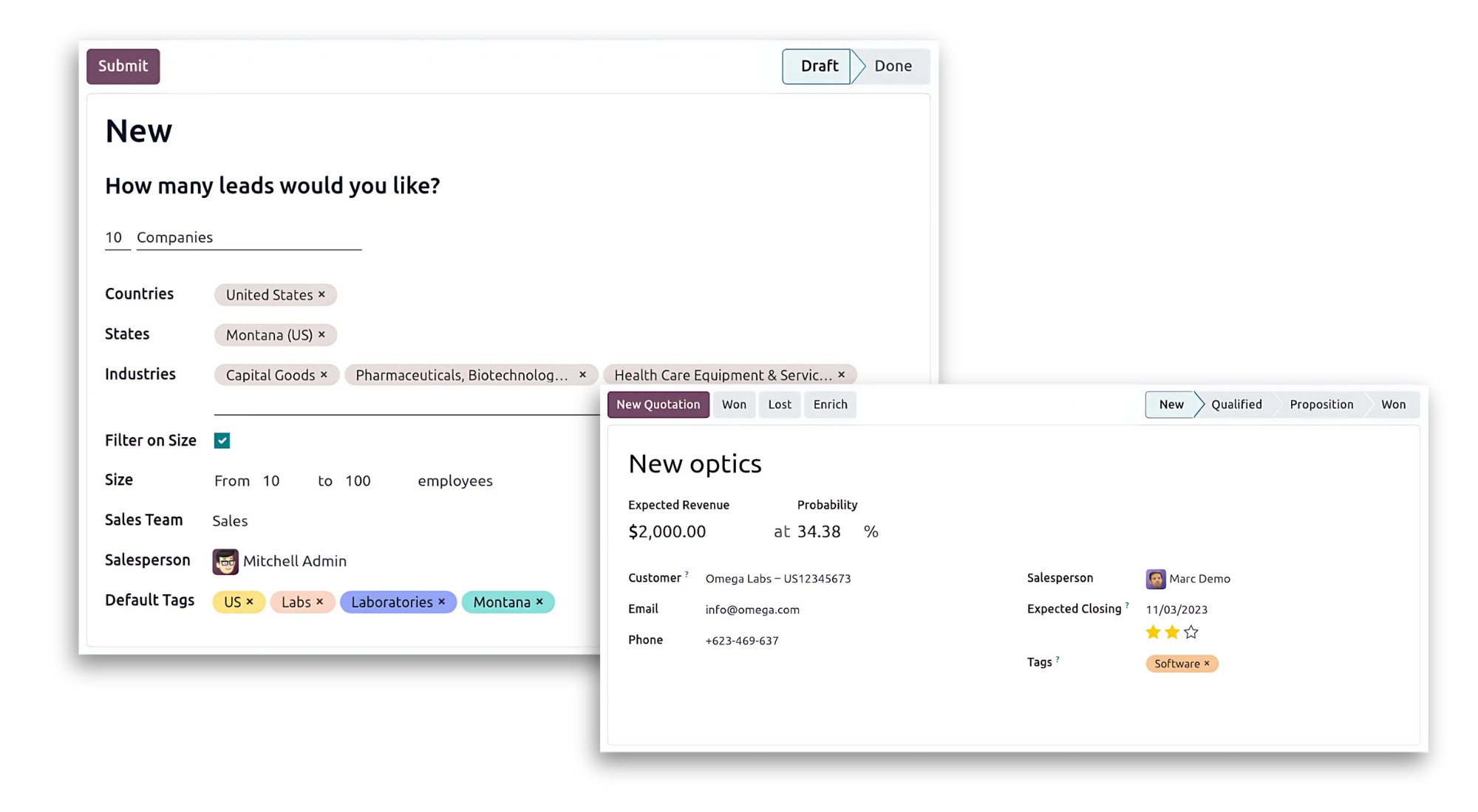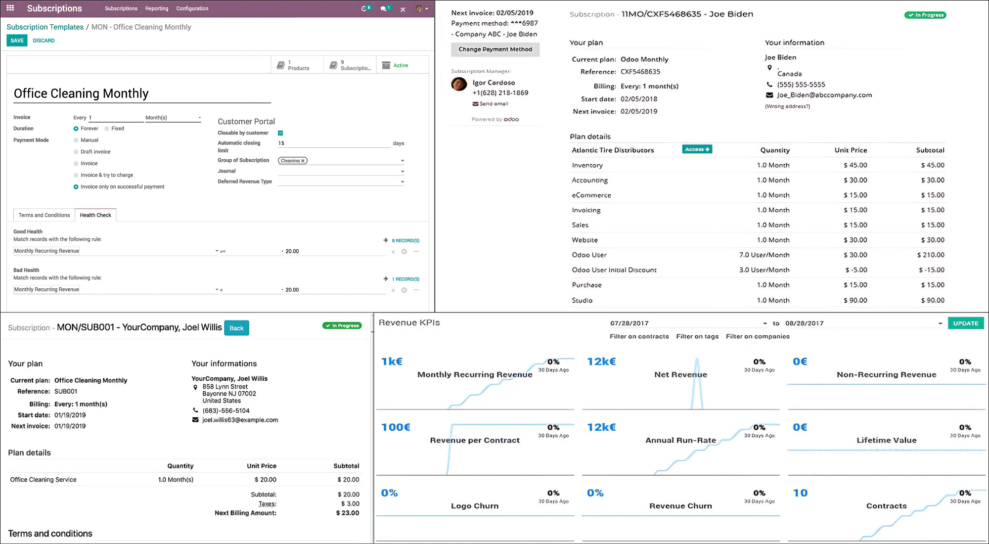 - Quản lý hợp đồng: Theo dõi từng giai đoạn của hợp đồng như lập hóa đơn, gia hạn và upsell. Quản lý các hóa đơn định kỳ với Odoo Subscriptions. Hoặc tạo các mẫu hợp đồng tùy chỉnh.