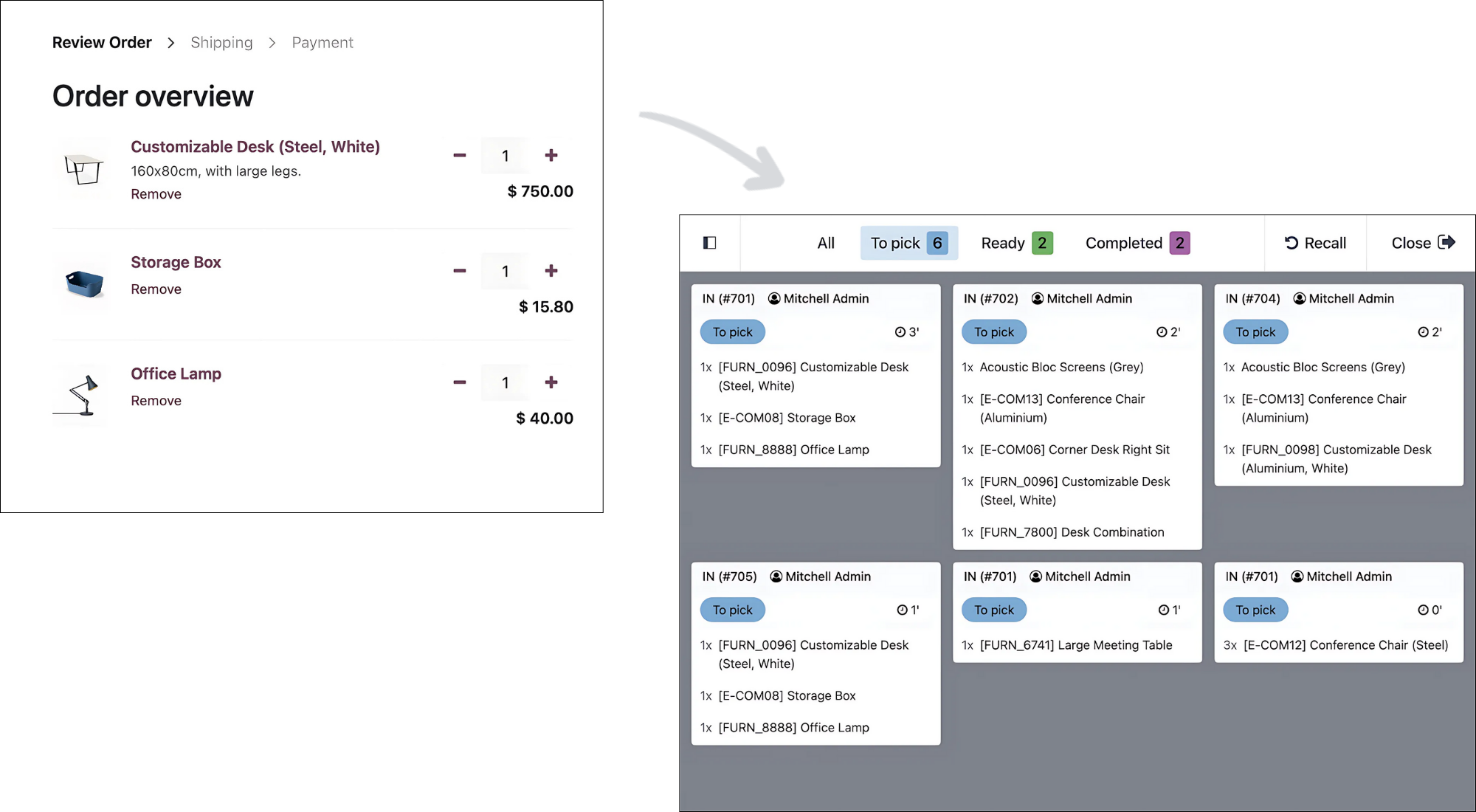 - Vận chuyển: Tự động tính toán chi phí vận chuyển (dựa vào trọng lượng, số lượng, lợi nhuận, địa chỉ giao hàng), in nhãn vận chuyển và theo dõi đơn hàng. Odoo còn tích hợp với các dịch vụ vận chuyển bên thứ ba.