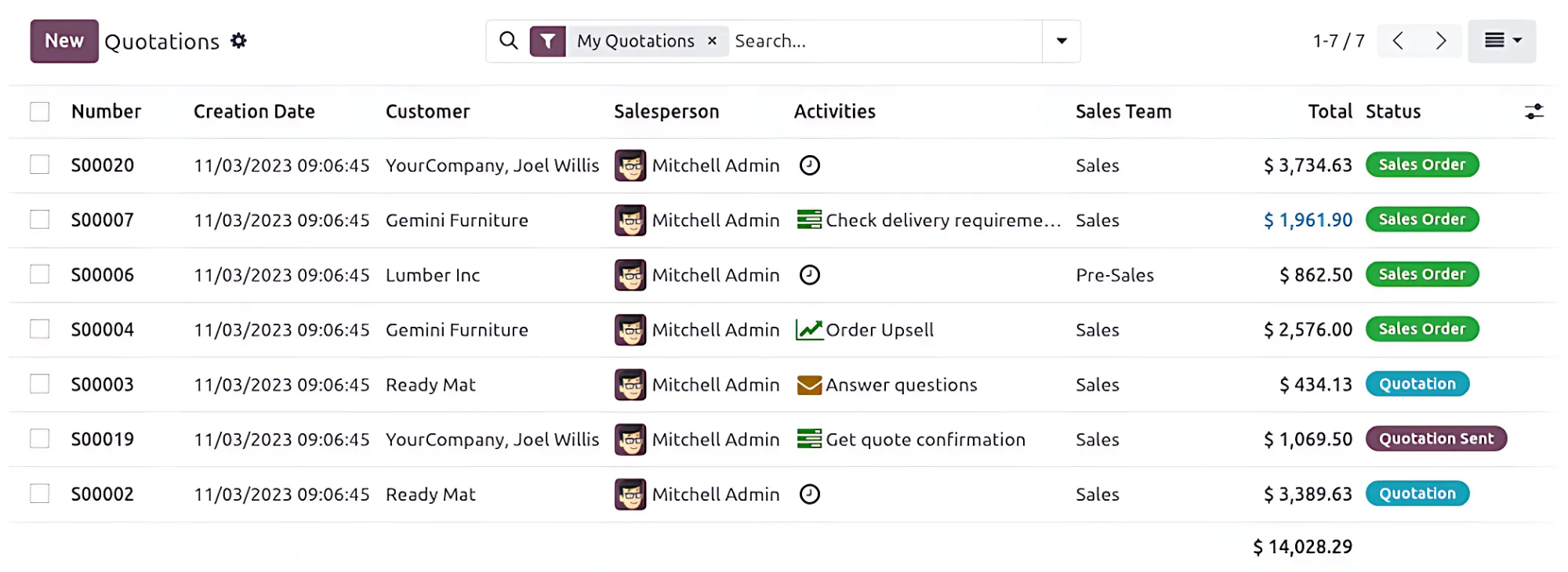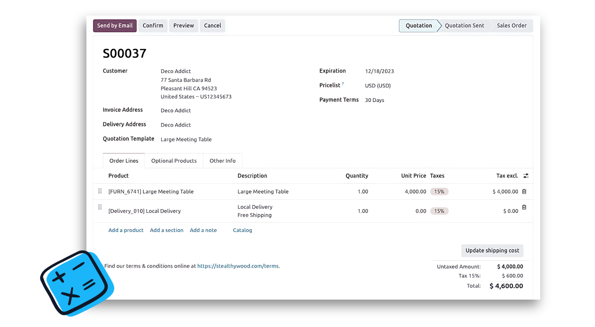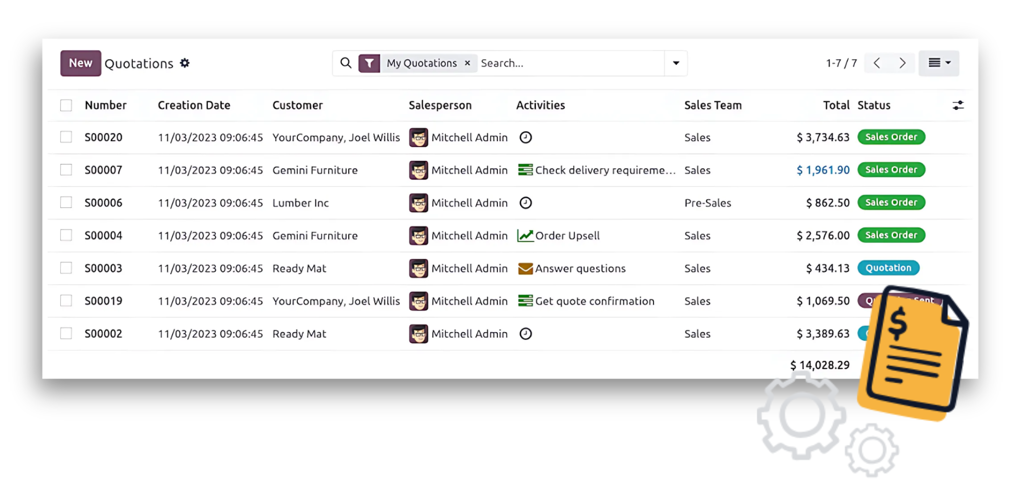 Tạo báo giá mới hoặc sử dụng mẫu báo giá. Lập và gửi hóa đơn chiếu lệ (Proforma invoice) đến khách hàng. Odoo còn tính hợp thêm tính năng Upselling và Chữ ký điện tử giúp bán được nhiều hàng và gia tăng tốc độ chốt sales.