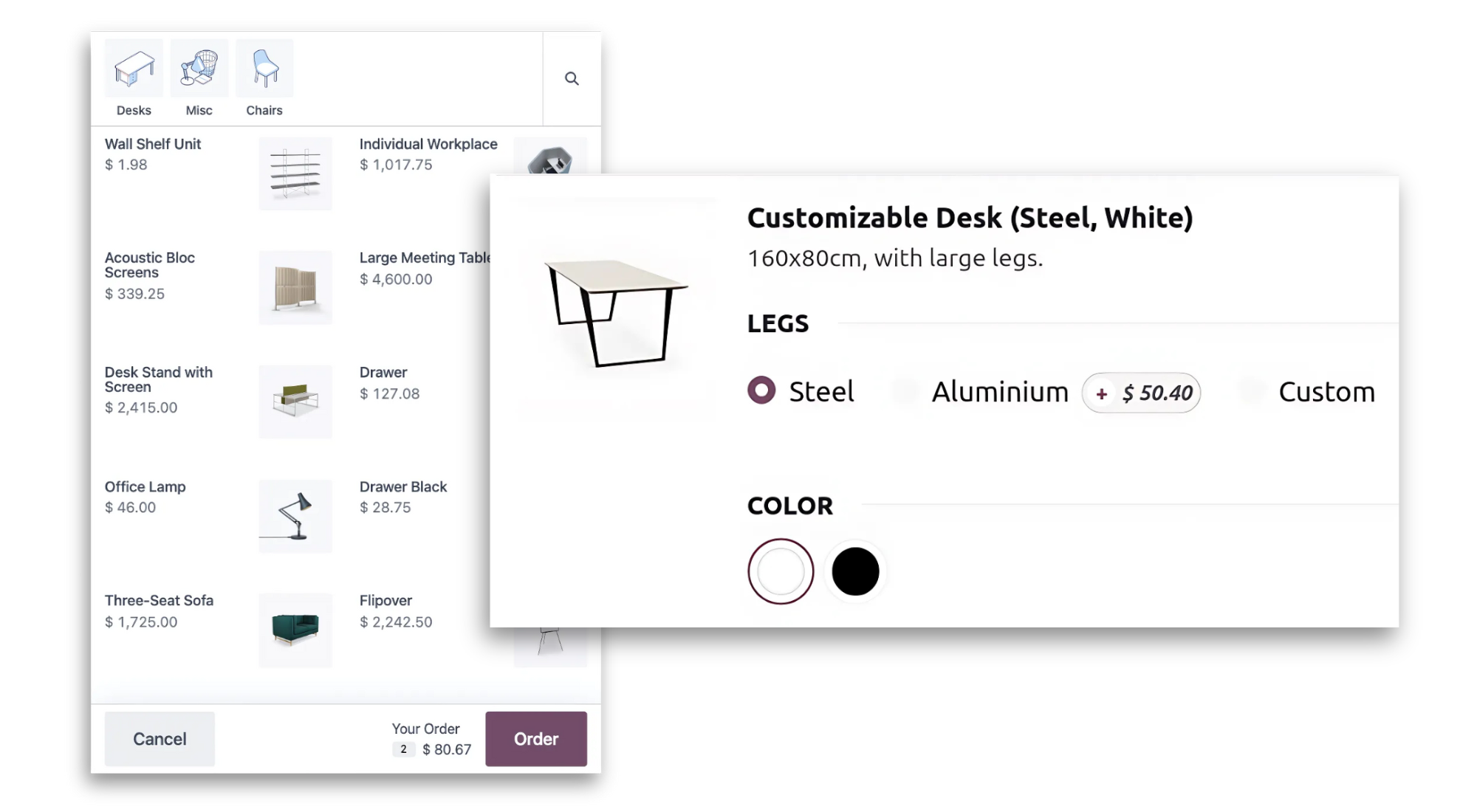 - Biến thể sản phẩm: Tùy chỉnh cấu hình sản phẩm với nhiều nhiều thuộc tính và biến thể như kích thước, màu sắc, thành phần, đơn vị tính,… Quản lý nhiều loại sản phẩm khác nhau (sản phẩm lưu kho, dịch vụ, tiêu thụ, phí giao hàng và sản phẩm điện tử).