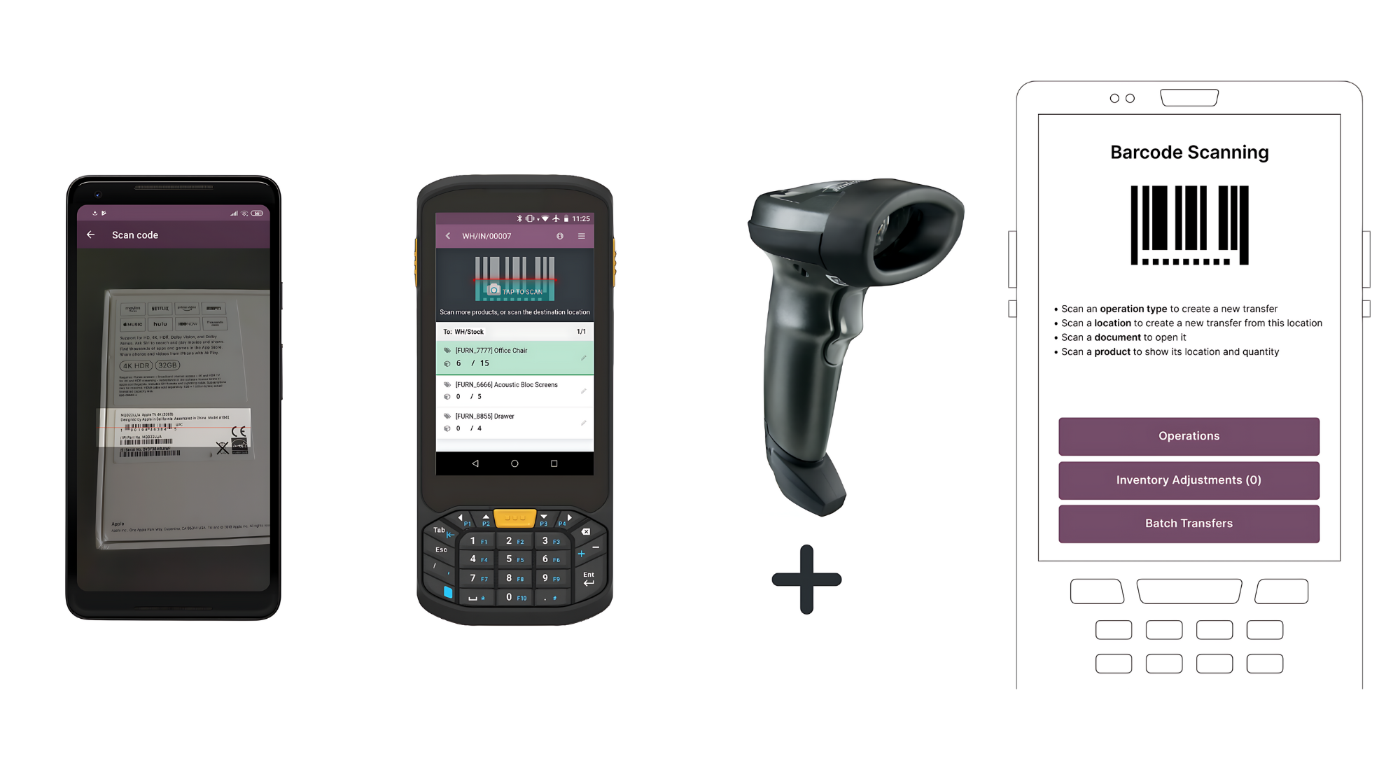 - Mã vạch: Sử dụng mã vạch để đẩy nhanh hoạt động sản xuất: quét số lô/số sê-ri, khởi động/tạm dừng/dừng đồng hồ bấm giờ, tạo yêu cầu bảo trì, chuyển sang bước tiếp theo,…